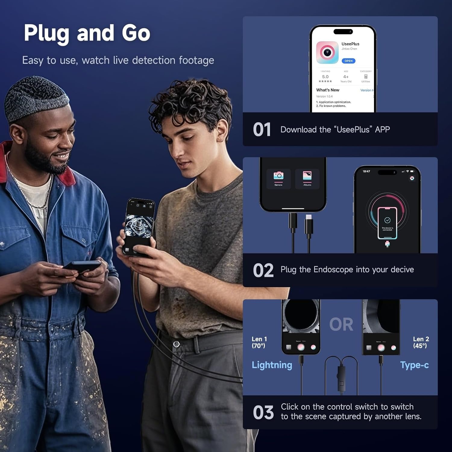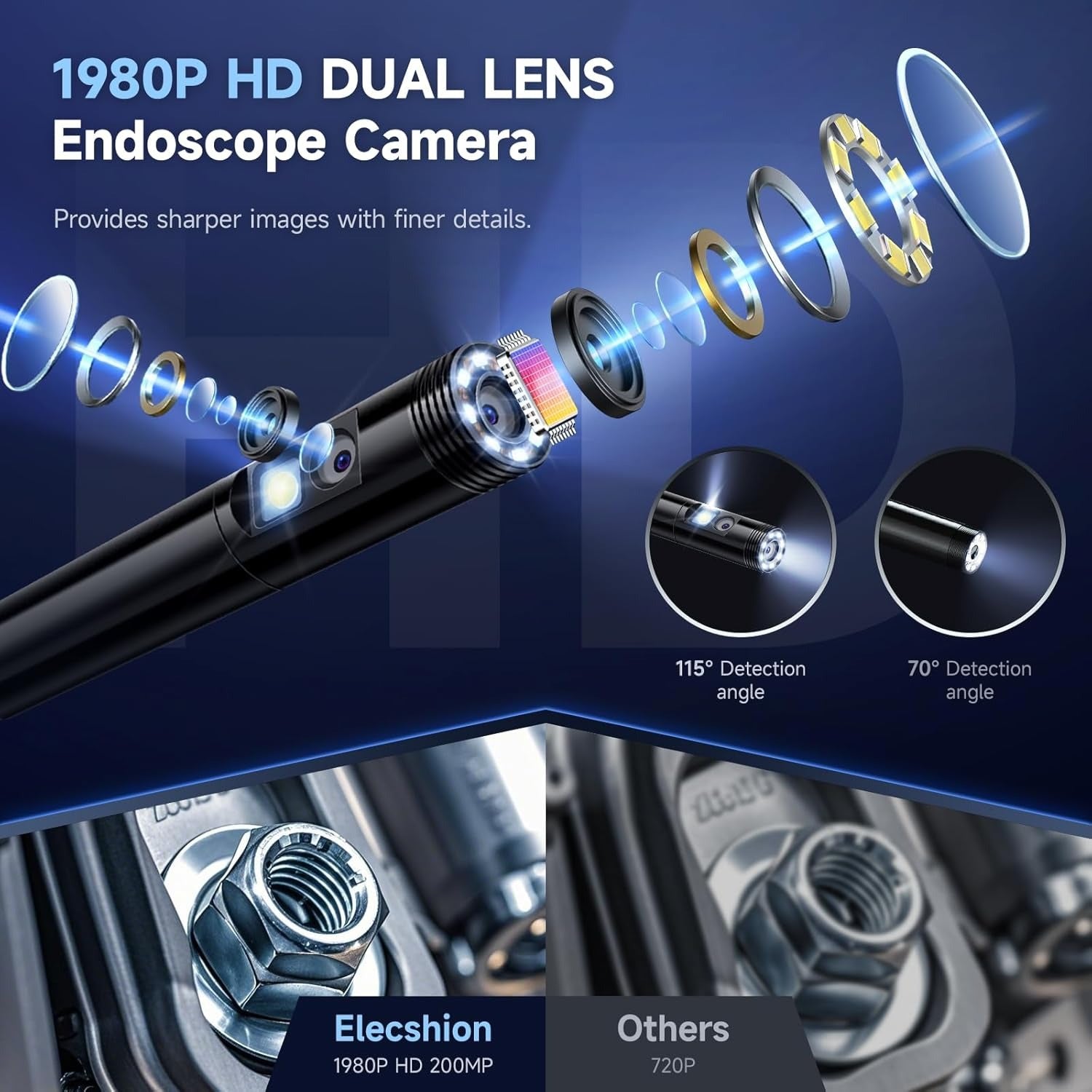 تمنحك تقنية العدستين رؤية أوسع وأكثر دقة بفضل كاميرتين بدقة 2 ميغابكسل، لتقديم صور فائقة الوضوح تساعدك على فحص الأعطال بسهولة ودقة. يأتي الرأس النحيف للكاميرا بقطر 8mm مع مجال رؤية مثالي يتراوح بين 1.2–4 بوصة، مما يسمح لك بالوصول حتى إلى أضيق الأماكن.