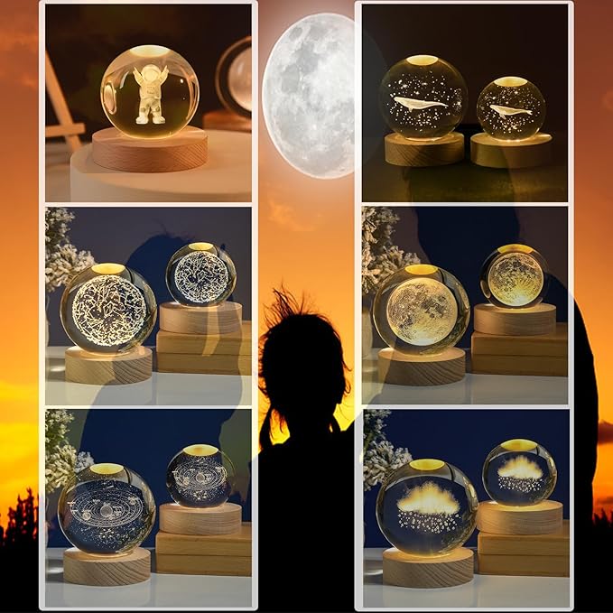الإضاءة البيضاء الدافئة (USB) تسلط الضوء على التفاصيل المحفورة داخل الكرة الشفافة، فتخلق جوًا رومانسيًا، هادئًا وحالمًا يضفي لمسة فنية داخل منزلك.