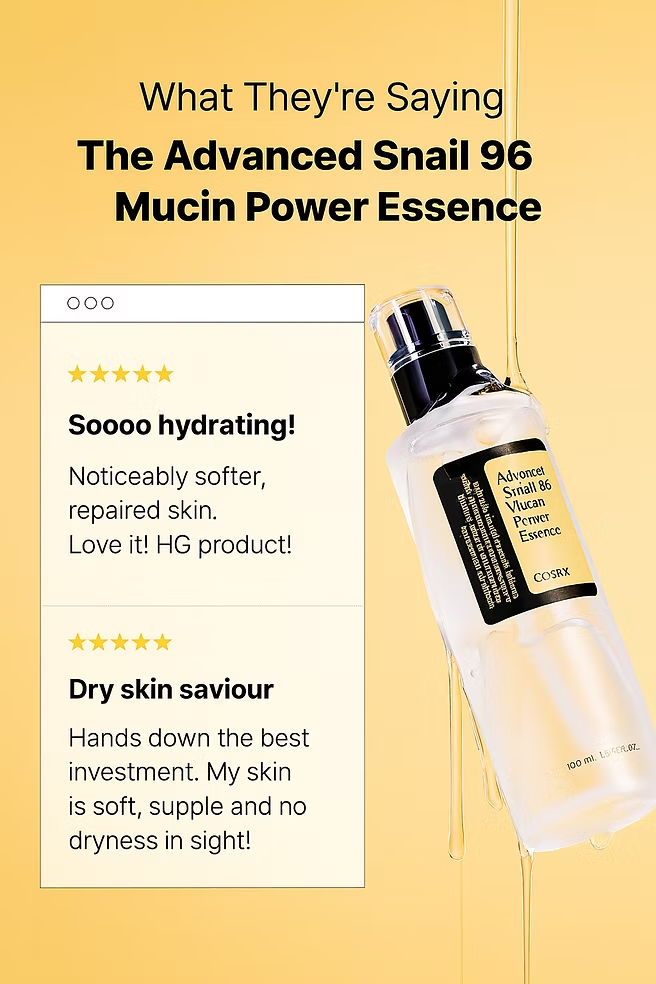 إيسنس COSRX Advanced Snail 96 Mucin Power Essence هو تركيبة غنية ومرطّبة بعمق، تحتوي على 96٪ من مستخلص مخاط الحلزون.
